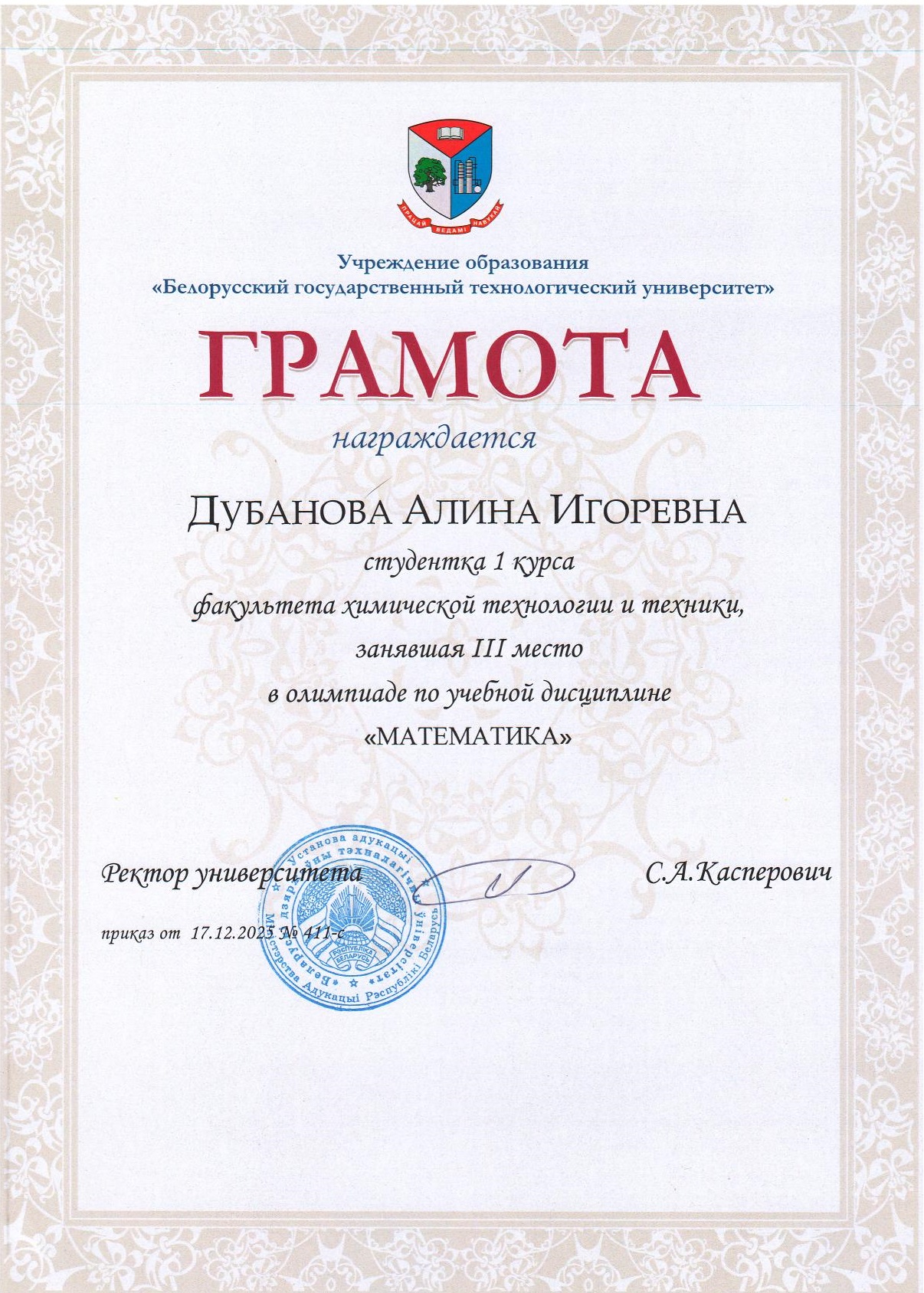 3 место - Чертко Матвей Геннадьевич (3 курс 15 группа)