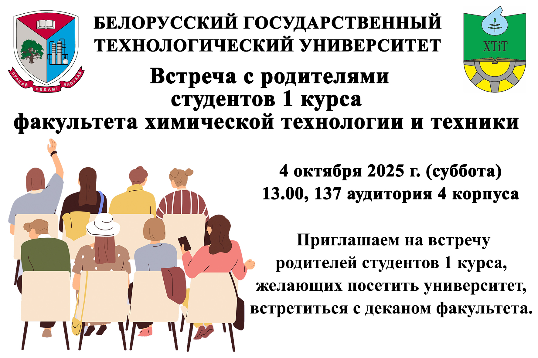 В субботу (4 октября) на базе университета состоялся диалог представителей деканата с родителями первокурсников факультета химической технологии и техники. На встрече присутствовало около 40 человек, прибывших из различных регионов республики и г. Минска. Цель данного мероприятия – знакомство с университетом, особенностями образовательного процесса, обсуждение проблемных вопросов, с которыми сталкиваются первокурсники.